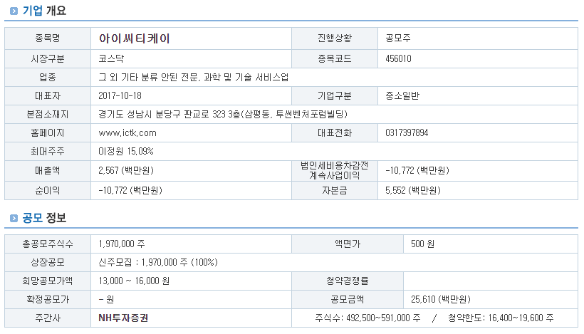아이씨티케이 공모주 수요예측 예정일 희망공모가