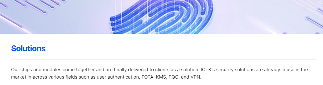 ㈜아이씨티케이는 글로벌 보안 트렌드에 발맞춰 독자적인 보안 IP를 기반으로 한 Security System-on-Chip(SoC)과 소프트웨어를 아우르는 수직 계열화된 보안 기술을 구현한 기업입니다. 당사는 반도체 제조공정 중 발생하는 편차를 활용한 "Inborn ID" 생성 기술인 "Physically Unclonable Function(PUF: ISO/IEC 20897)"을 VIA PUF라는 자체 기술로 상용화하는 데 성공했습니다.