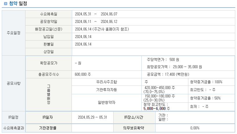 | 공모청약일 | 2024.06.11 ~ 2024.06.12 |