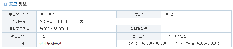 | 공모정보 | - 공모주식수 60만 주, 공모 금액 174억 원 - 주관사는 한국투자증권 - 일반청약자 배정물량 15 |