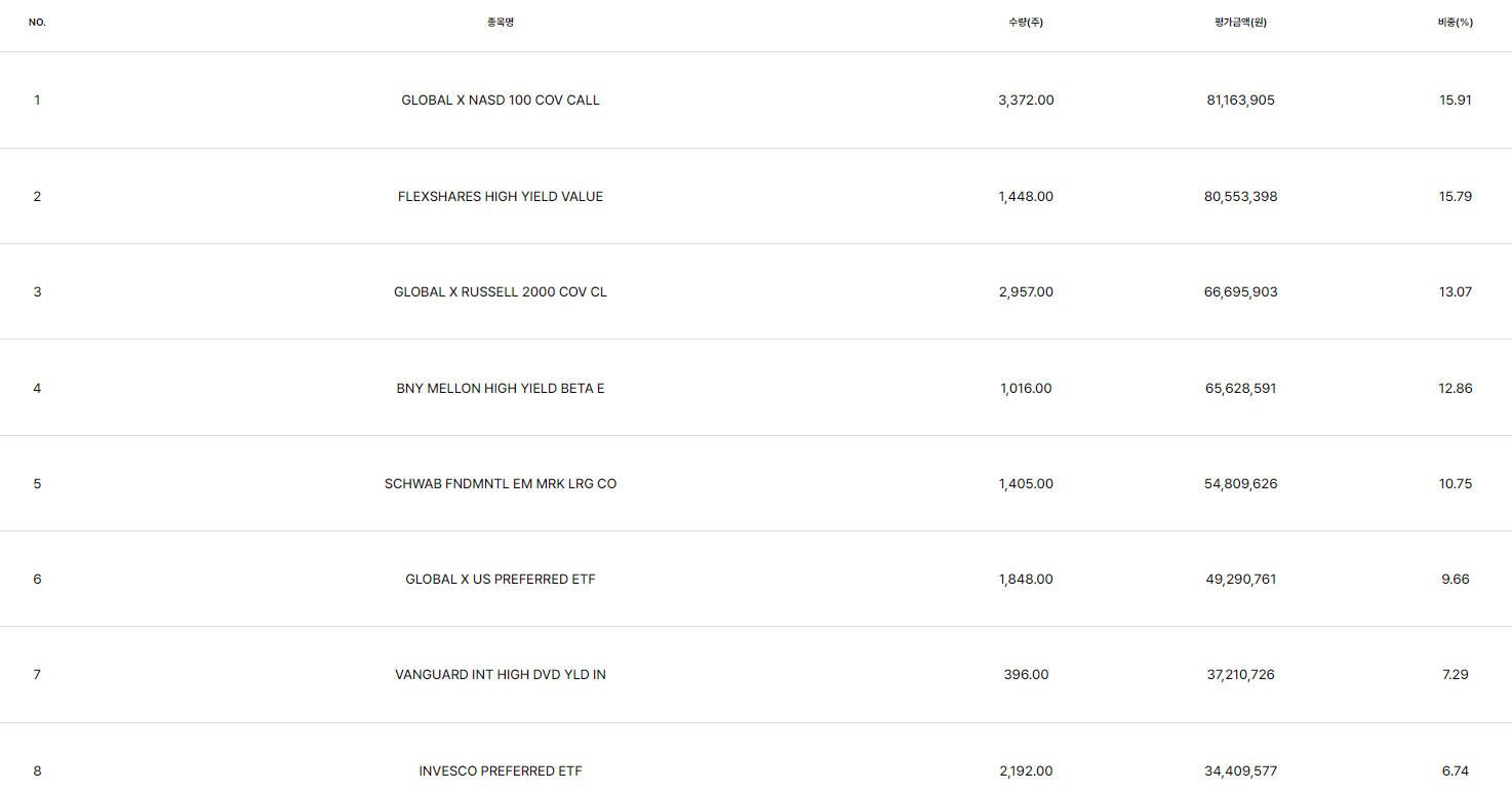 편입 종목 현황을 살펴보면 GLOBAL X NASD 100 COV CALL, FLEXSHARES HIGH YIELD VALUE 등 미국에서 거래되는 고배당 ETF들이 포트폴리오의 주요 부분을 차지하고 있습니다.