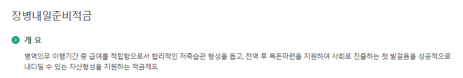 | 개요 | 장병들의 건전한 저축 습관 형성 및 전역 후 목돈 마련 지원 |