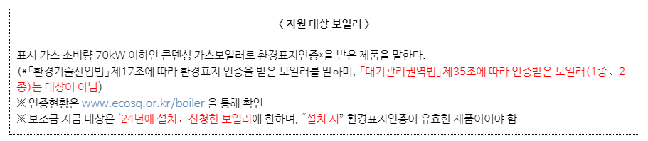 | 지원 내용 | - 보일러 1대당 60만원 지원 (총 200대 지원 예정) - 환경표지인증 획득 가스 소비량 70kW 이하 콘덴싱 가스보일러 - 2024년 설치 및 신청 보일러로 한정 |