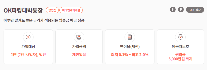 간만에 대박 통장이 하나 나왔습니다. 금리가 무려 2%입니다. 파킹통장 중에는 아마 현존 최고의 금리가 아닐까 합니다. 출시은행은 바로 OK저축은행이고 상품명은 OK파킹대박통장입니다. 요즘 저축은행도 다 비대면개설이 되고, 예금자보호까지 되니 저축은행이라고 꺼려하시는 분들은 없으실 겁니다. 그럼 OK파킹대박통장에 대해서 더 자세히 살펴보도록 하겠습니다.