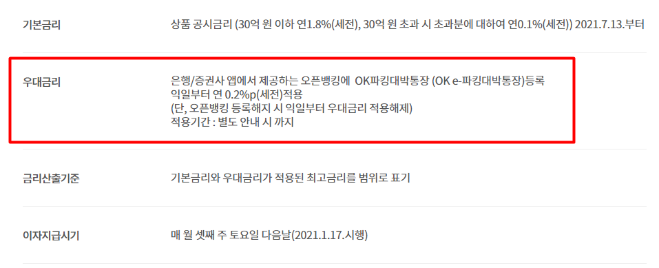 기본금리는 1.8%이고 우대금리가 0.2%로 최고 금리 2%입니다. 우대금리 받는 것도 정말 쉽습니다. 그냥 은행/증권사 앱에서 제공하는 오픈뱅킹에 OK파킹대박통장 등록만 하면 다음날부터 바로 적용됩니다. 반대로 오픈뱅킹 등록해지 시 바로 우대금리 적용해제 되구요. 오픈뱅킹 그냥 손가락 몇번만 하면 되는 거라서 우대금리는 거저 준다고 생각하시면 됩니다.