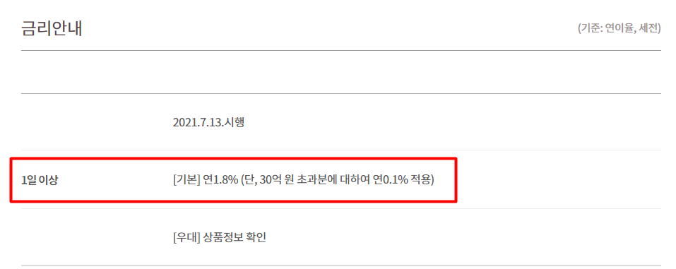가입대상은 개인/법인이구요, 가입금액이 제한이 없습니다.(단, 30억원 초과분은 금리가 0.1%입니다.) 연이율은 최고 2.0% 입니다. 당연히 예금자보호로 원리금 5,000만원까지 보호 가능합니다. 더 자세히 보겠습니다.