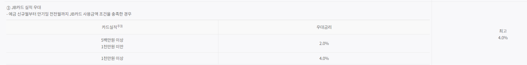 카드 실적이 연 5백만원이상이면 우대금리 2%, 1천만원 이상이면 4%입니다. 이정도면 그냥 우리 매직 적금이 더 낫다고 볼 수 있겠습니다.