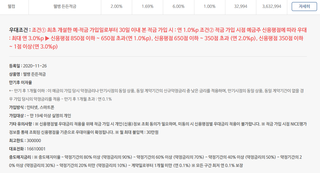 웰뱅 든든적금은 최고 4%의 적금금리를 주는데요, 희한하게 신용등급 평점에 따라서 우대이율이 정해드립니다. 그런데 보시면 아시겠지만 신용등급이 더 낮아야 높은 우대이율을 줍니다. 신용등급이 낮으신 분들을 대상으로 하는 적금입니다.