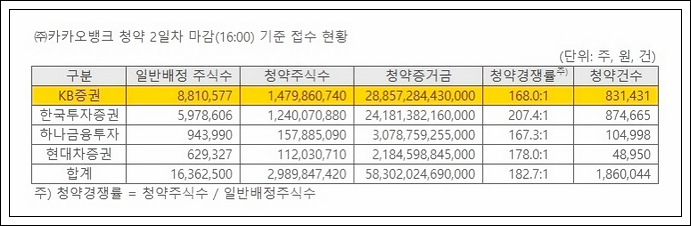이번 카카오뱅크 공모두 청약 접수 현황입니다. KB증권을 예시로 들어보도록 하겠습니다.