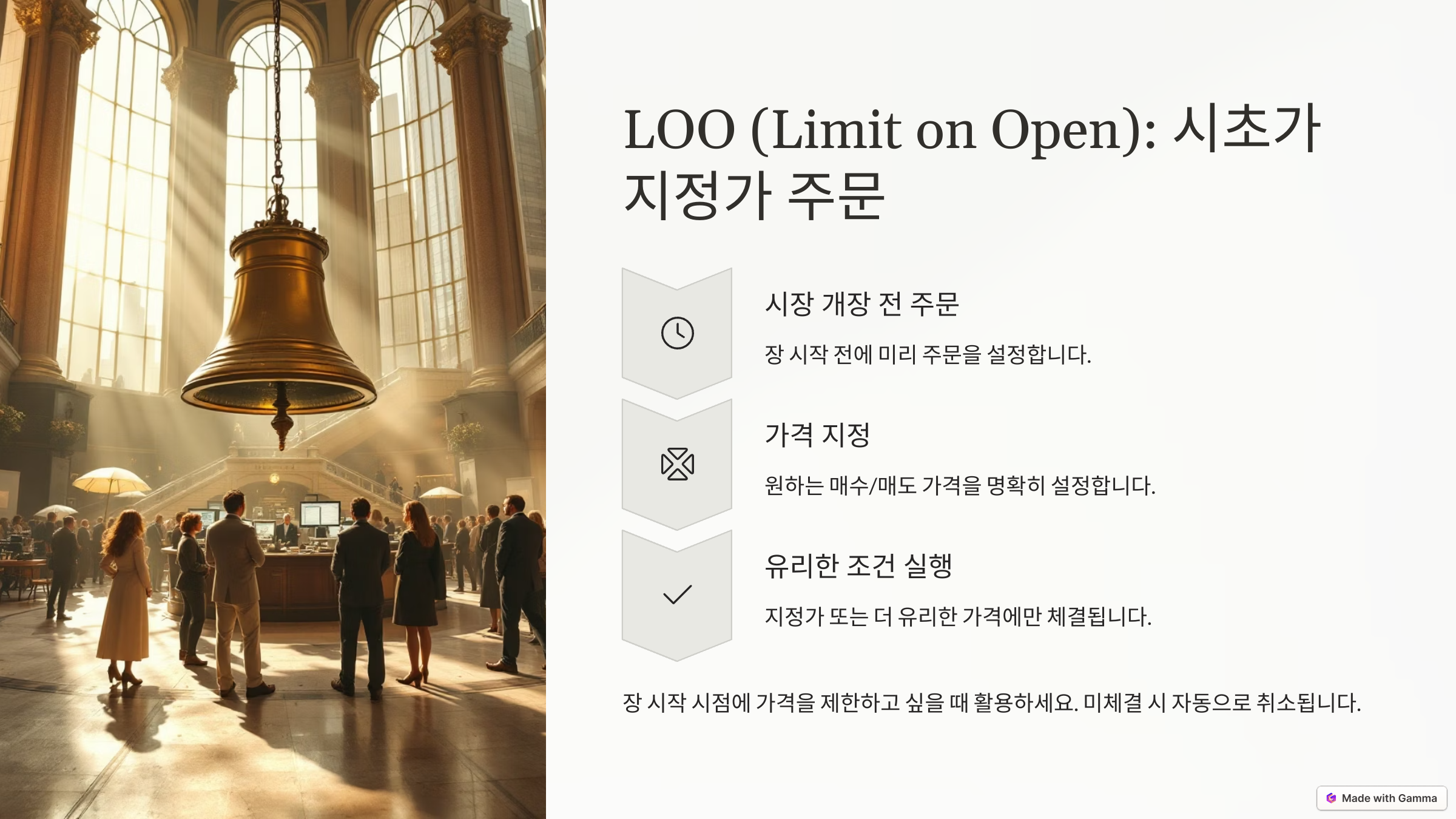 | LOO (Limit On Open) | 개장 시점의 지정가 주문 | 개장가 근처에서 원하는 가격대에 거래 가능 | 조건 미충족 시 자동 취소됨 | 개장 시점의 가격 변동에 대비하는 전략적 투자자 |