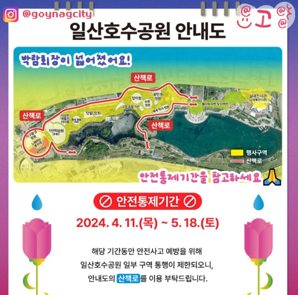 다만 행사 기간 동안 안전사고 예방을 위해 일산호수공원 일부 구역은 통행이 제한될 예정이오니, 방문하실 때는 안내된 산책로를 이용해 주시기 바랍니다. 통제 기간은 2024년 4월 11일(목)부터 5월 18일(토)까지이니 참고하시기 바랍니다.