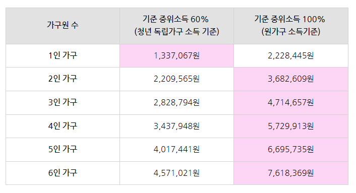 - 소득 기준: 청년 독립가구의 소득이 기준 중위소득 60% 이하이면서 원가구 소득이 중위소득 100% 이하