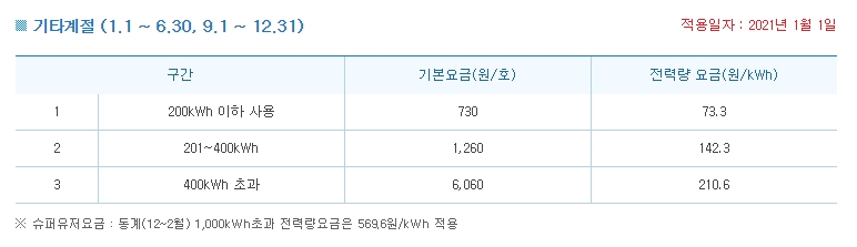 한시간에 W가 소비되고 이게 24시간 × 30일입니다. 아파트라면 거의다 고압이고 전기세 요금표는 아래와 같습니다.