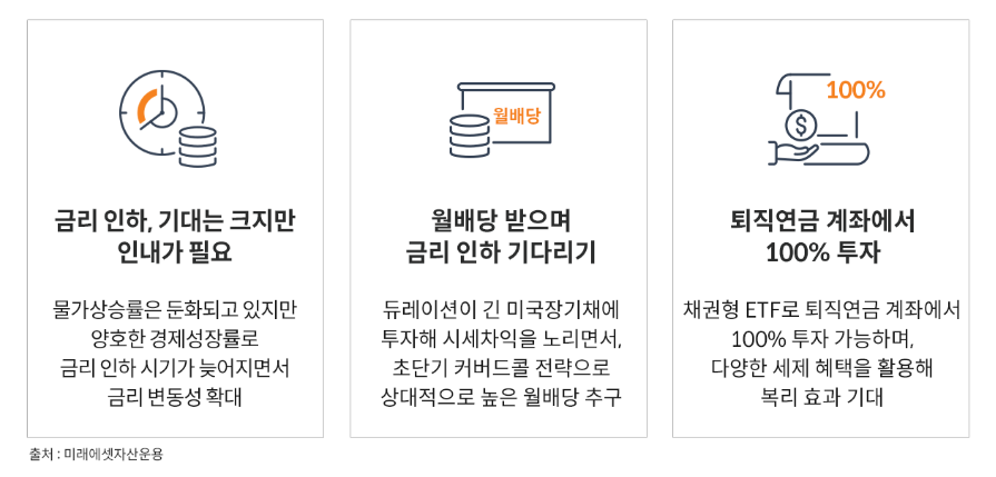 이 ETF는 미국 30년물 국채에 투자하는 동시에 콜옵션 매도를 병행해 채권 투자에 따른 안정성을 확보하면서도 추가 수익 창출을 도모합니다. 금리 인하를 기다리며 월 분배금도 수취할 수 있어 일석이조의 매력을 자랑하고 있죠.