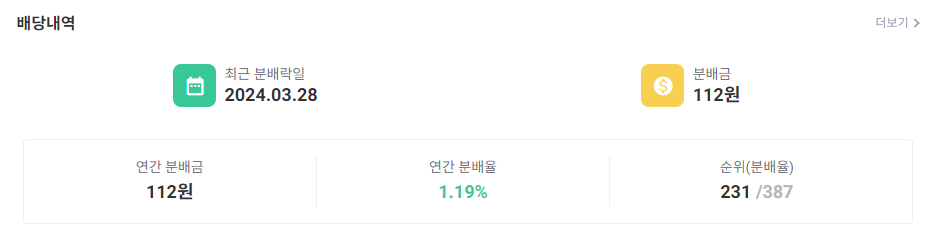 2024년 3월 기준 112원의 현금 분배가 이뤄졌으며, 연간으로는 1.19%의 배당률을 기록 중입니다. 최근 분배금 지급 내역은 다음과 같습니다.