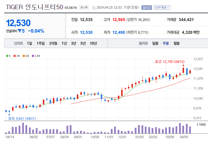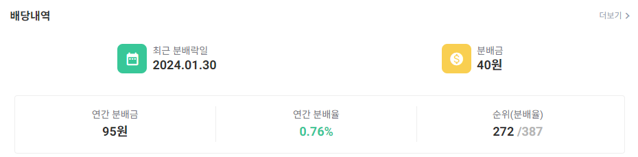 TIGER 인도니프티50 ETF의 배당은 다소 매력이 떨어지는 편입니다. 2024년 1월 30일자 분배금은 주당 40원이고, 연환산 시 95원 수준입니다.