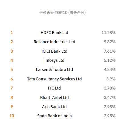 동 지수는 인도 유가증권 시장에 상장된 종목 중에서도 시가총액 상위 50개 블루칩 종목으로 구성된 대표지수입니다. 인도 경제를 이끄는 금융, IT, 에너지, 필수소비재 등 핵심 섹터의 우량 기업들로 이뤄져 있죠.